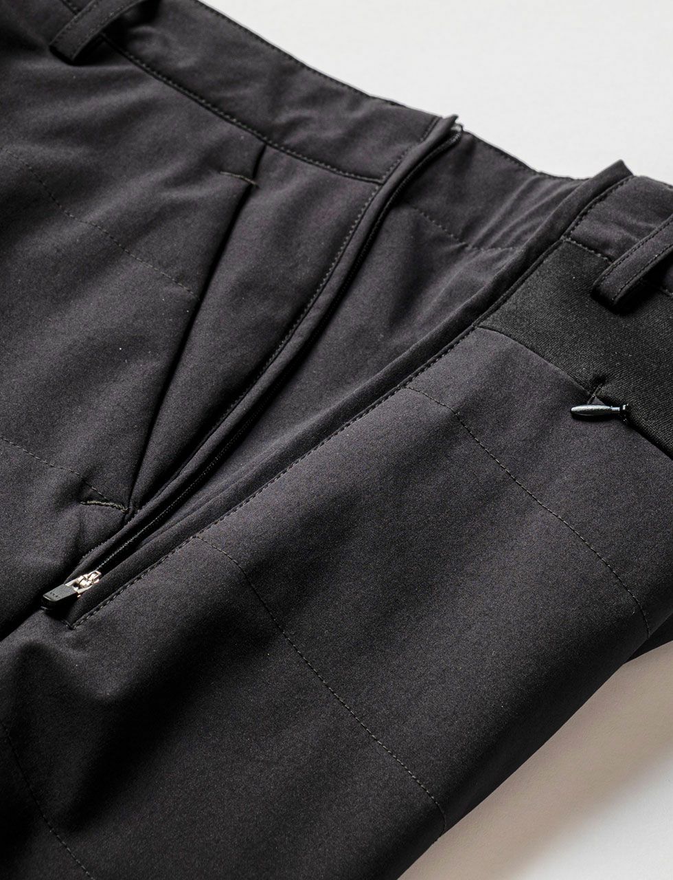 両サイドにあるファスナーを開けば、片側約7cmのマチが出現。お腹周りが心配でウエストサイズが不安な方も安心してウエストサイズを簡単にアップする事ができます。ファスナーは引き手を倒すとロックがかかるので、微妙なサイズ調整が可能です。