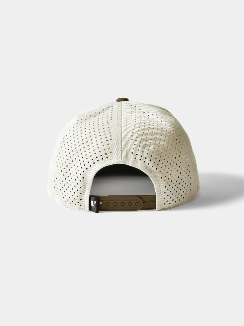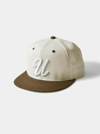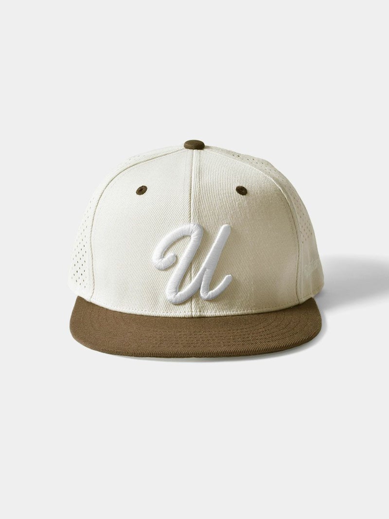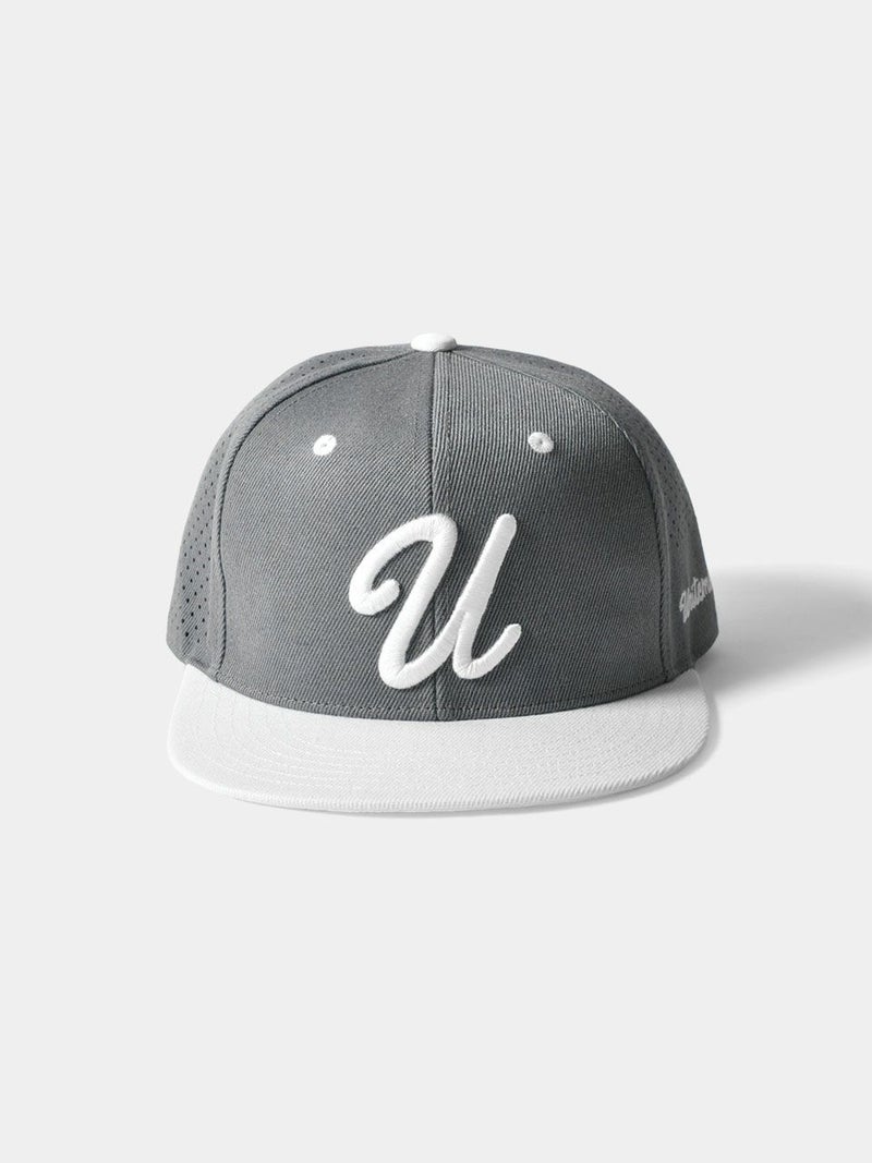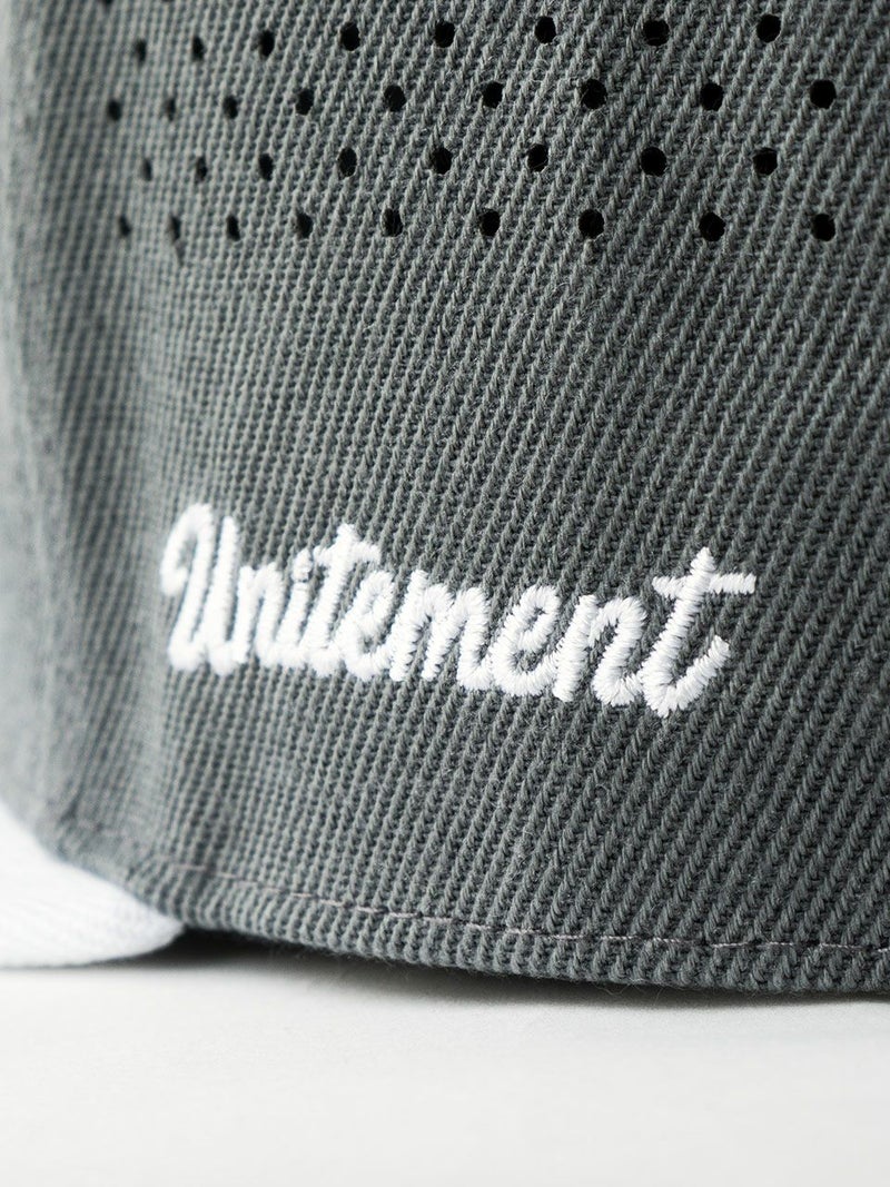 パンチング加工を施して通気性を高めた、クラシックなアルファベットが特徴的なゴルフキャップ。
