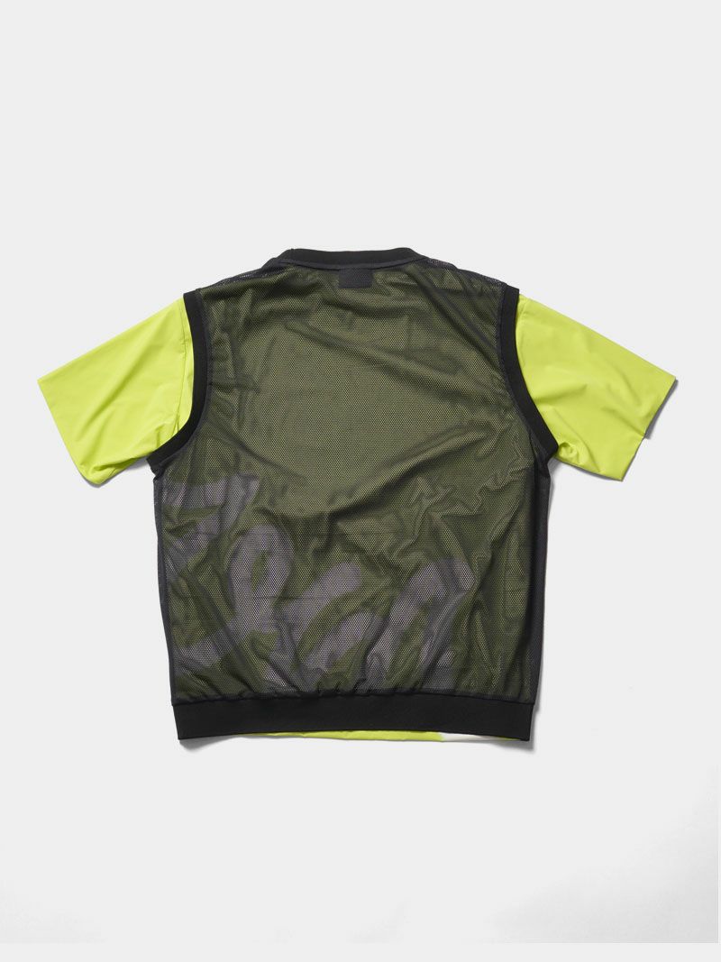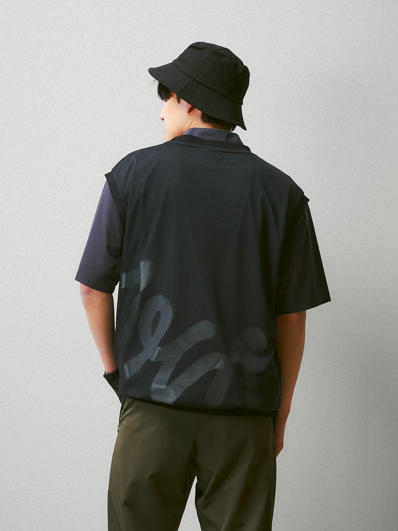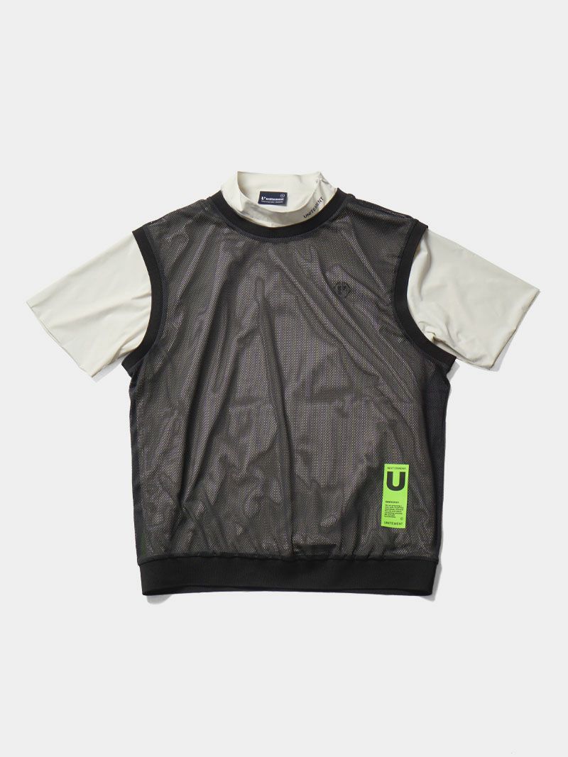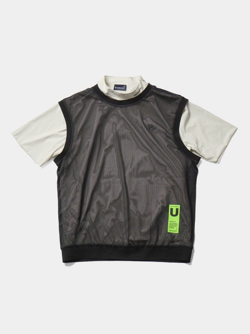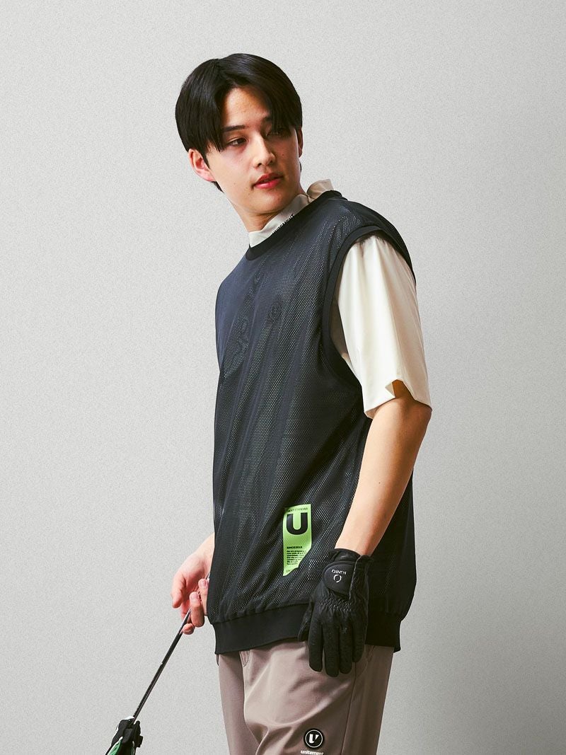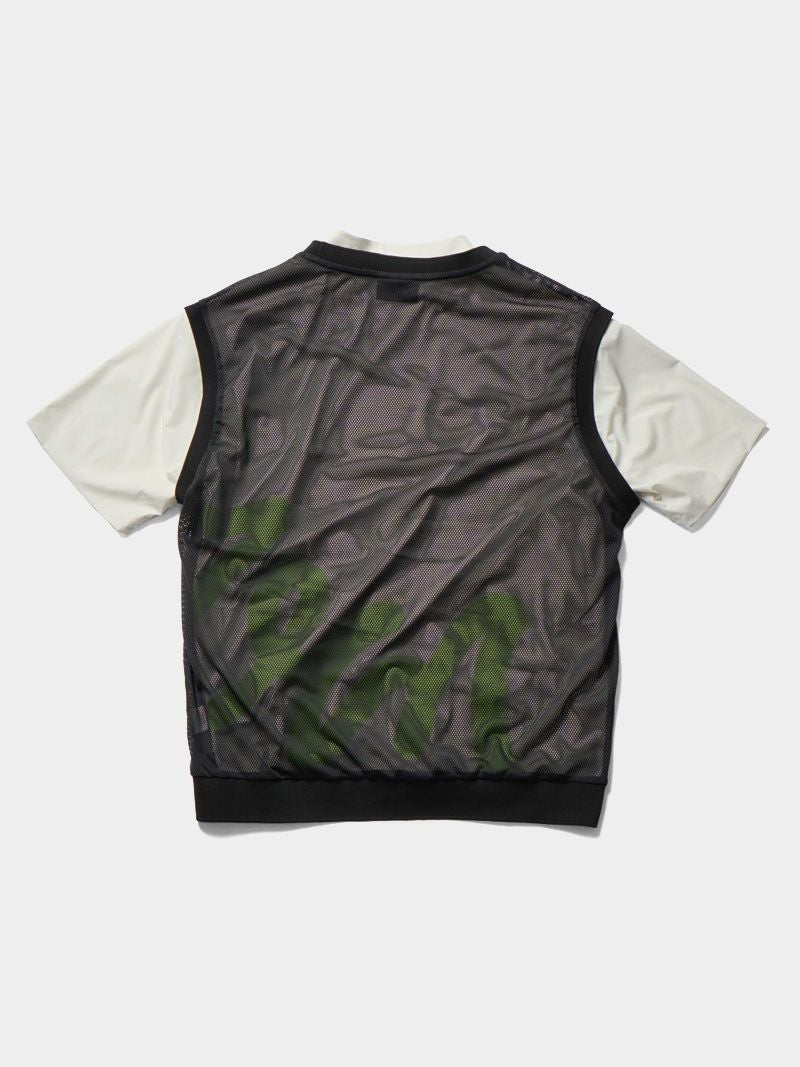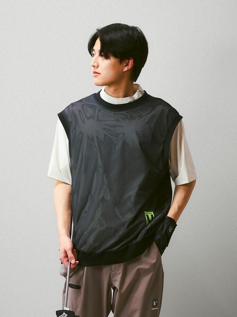 バックプリントが特徴的なモックネックシャツに、メッシュベストを合わせた2WAY仕様のゴルフシャツ。