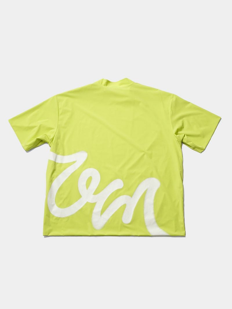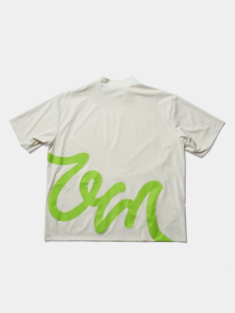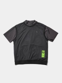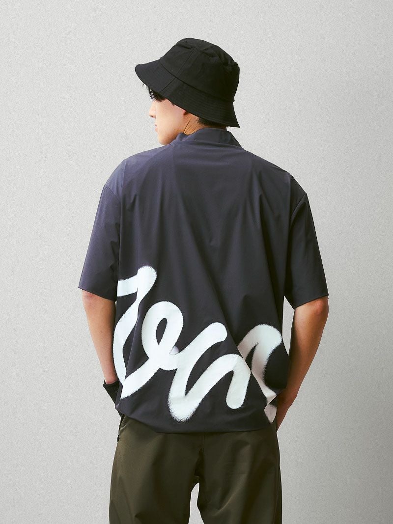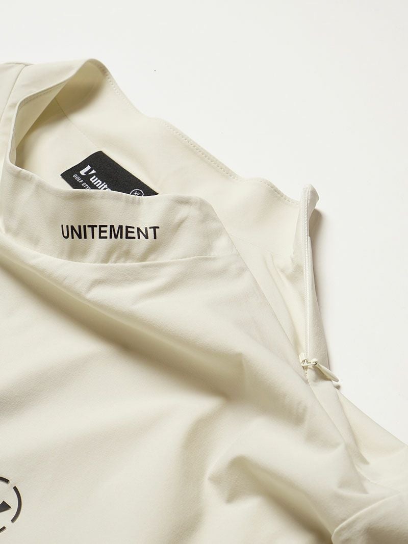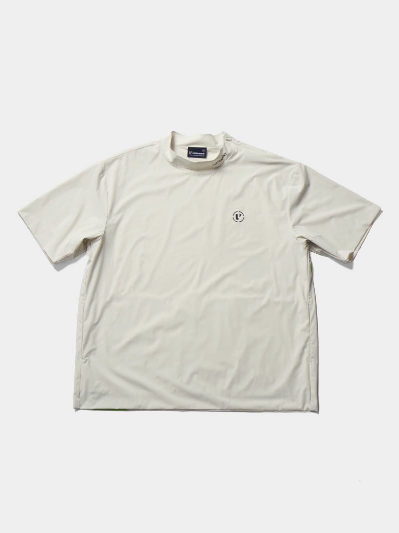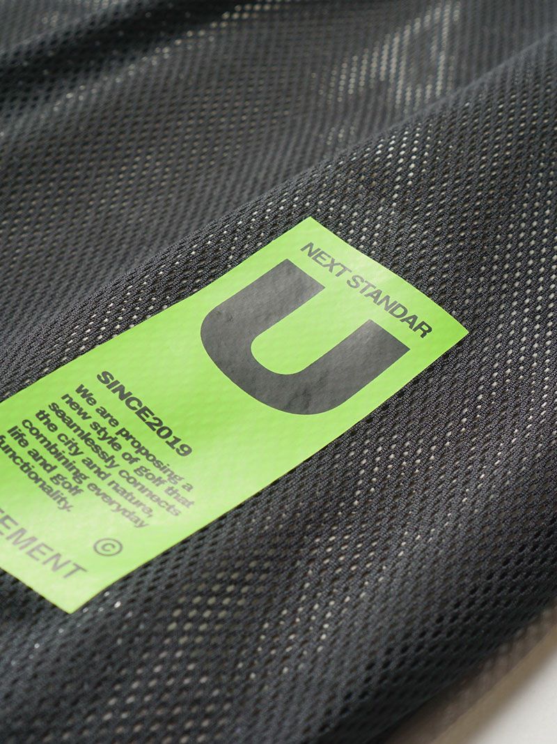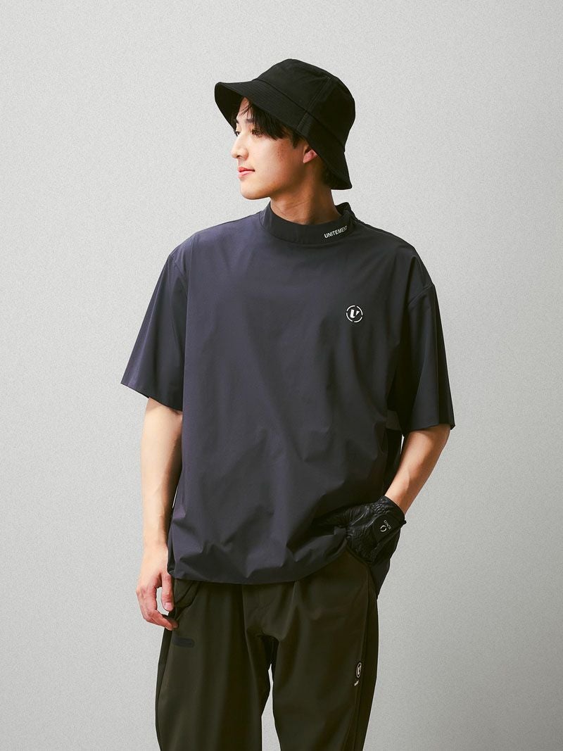 バックプリントが特徴的なモックネックシャツに、メッシュベストを合わせた2WAY仕様のゴルフシャツ。